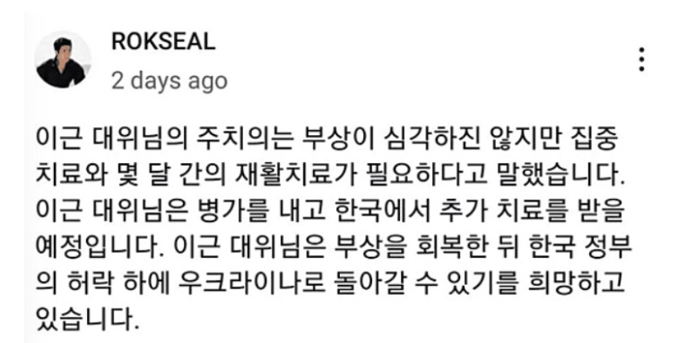 또 “이근 대위님은 병가를 내고 한국에서 추가 치료를 받을 예정“라며 “부상을 회복한 뒤 한국 정부의 허락하에 우크라이나로 돌아갈 수 있기를 희망하고 있다“고 심경을 밝혔다.