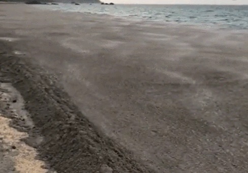 화산에서 5억 3제곱미터나 되는 엄청난 양의 경석을 분출한 것이며, 이런 어마어마한 양의 경석은 전부 바다 속으로 가라앉지 못하고 해안 표면 위를 뒤덮었다.