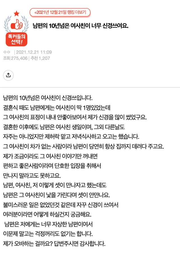 21일 네이트판에 “남편의 10년넘은 여사친이 너무 신경쓰여요” 라는 글이 올라와 화제에 올랐다.