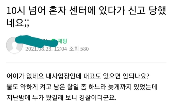 한 인터넷 카페에 ’10시 넘어 혼자 센터에 있다가 신고당했어요’라는 글이 올라왔다.