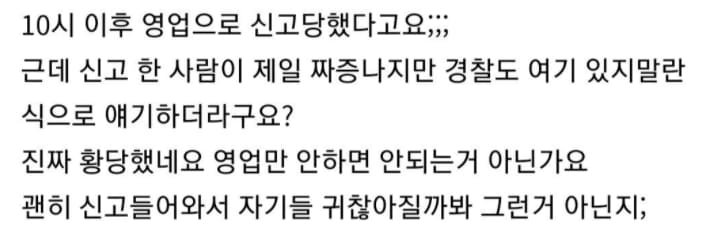 끝으로“영업만 안 하면 되는 거 아닌가. 괜히 신고들어와서 자기들 귀찮아질까봐 그런거 아닌지..”라고 토로하면서 글을 마쳤다.