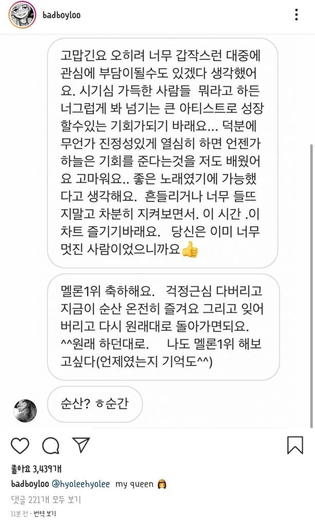 18일 오후 블루는 자신의 인스타그램에 “@hyoleehyolee my queen”이라며 이효리에게 받은 메시지를 공개했다.