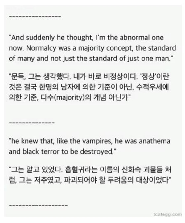작품의 말미로 갈수록 괴물들의 사회를 살아가는 네빌이 오히려 신화적 존재가 되는 것이다. 네빌이야 말로 괴물이고 비정상이었다는 것.