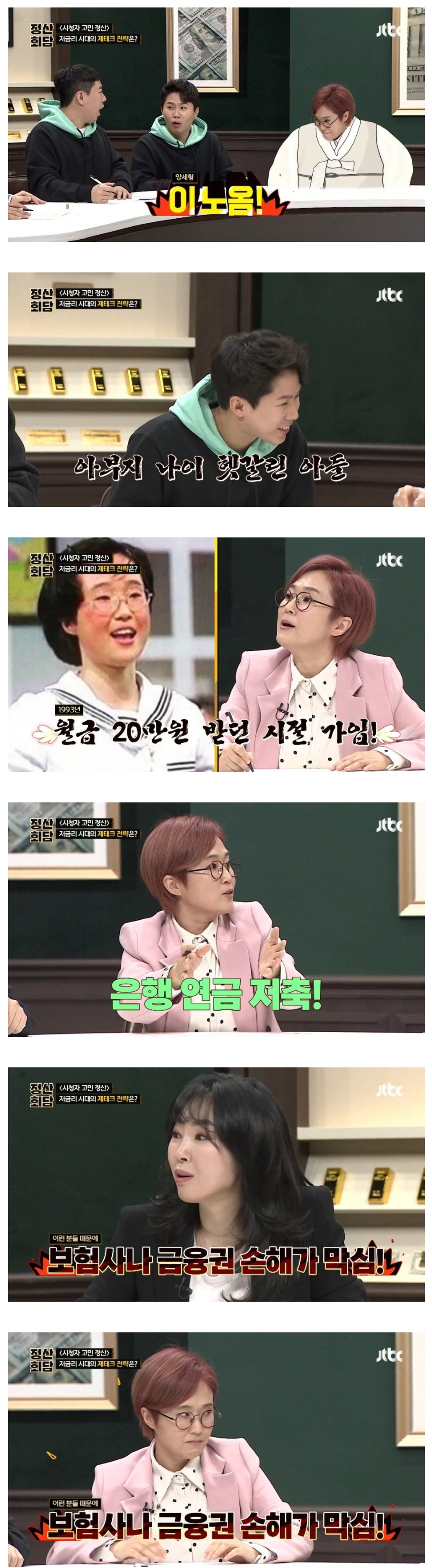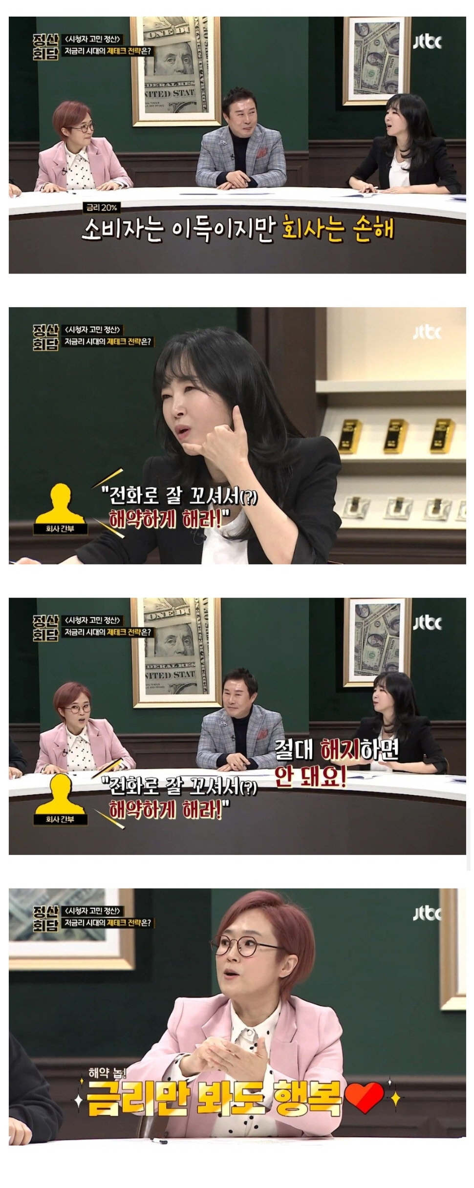이에 다른 출연진은 “이런 저축 때문에 보험사나 금융권 손해가 막심하다.”, “전화로 해약하게 하려고 하지만 절대 해약하면 안 된다.”라며 설명했다.