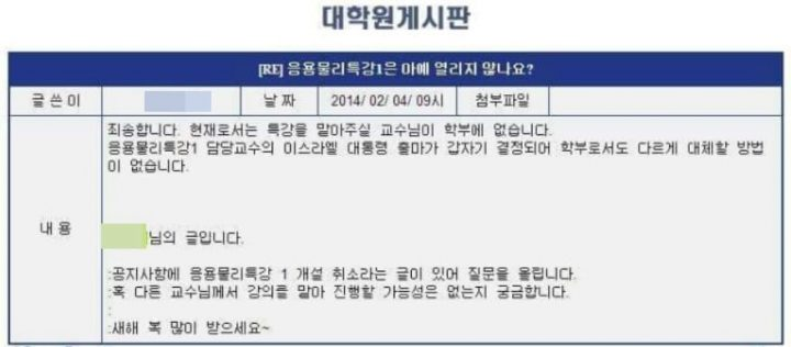 그러자 물리학과 관계자는 “죄송합니다. 현재로서는 특강을 맡아주실 교수님이 학부에 없습니다” , “응용물리학특강1 담당교수의 이스라엘 대통령 출마가 갑자기 결정돼 학부로서도 다르게 대처할 방법이 없습니다”라고 전했다.