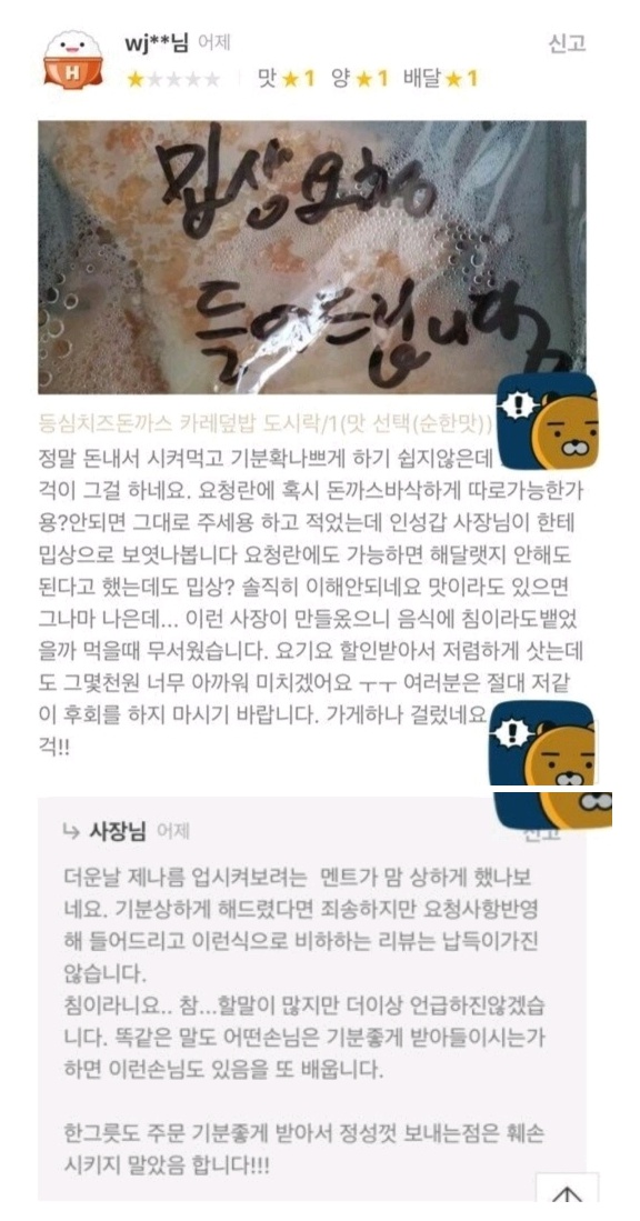 끝으로 “이런 사장이 만들었으니 음식에 침이라도 뱉었을까 먹을 때 무섭다”라며 “저렴하게 샀는데 그 몇천 원도 아깝다”고 전했다.