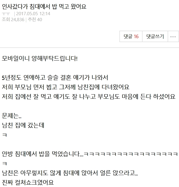 ‘인사 갔다가 침대에서 밥 먹고 왔어요’라는 제목의 게시물이 올라왔다.