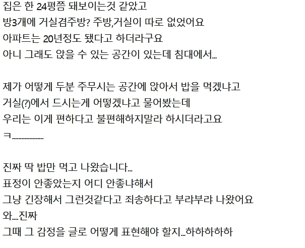 결국 A씨는 정말 딱 ‘밥만’ 먹고 부랴부랴 나왔다. 그 때의 그 감정을 어떻게 글로 다 표현할 수 있을까.