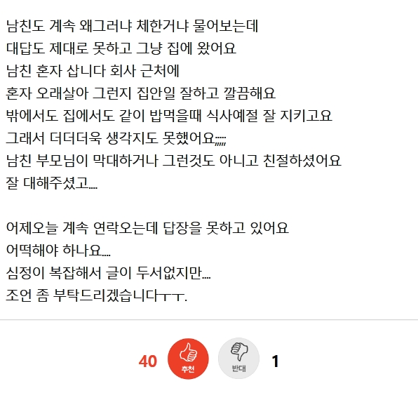 A씨는 “남친 부모님이 막 대하시거나 그런 것도 아니에요. 친절하셨어요. 잘 대해주셨고”라며 “근데 어제 오늘 답장을 못하고 있어요. 계속 연락이 오는데… 어떡하죠? 심정이 복잡해요. 조언 좀 부탁 드리겠습니다”라고 글을 마무리 지었다.