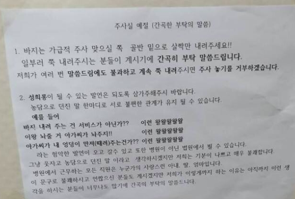 “저희가 여러번 말씀드림에도 불과하고 계속 쭉 내려주시면 주사 놓기를 거부하겠습니다”라고 적혀있었다.