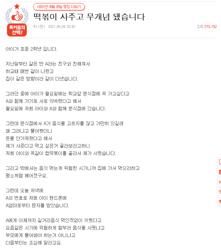 그런데 분식점에서 A가 음식을 고르지를 않고 가만히 있길래왜 그러냐고 물어봤더니 돈을 안가져왔다고 해서 제가 사준다고 먹고 싶은거 골라보라고하니 저희 아이와 똑같이 컵떡볶이를 골라서 제가 사줬습니다.
