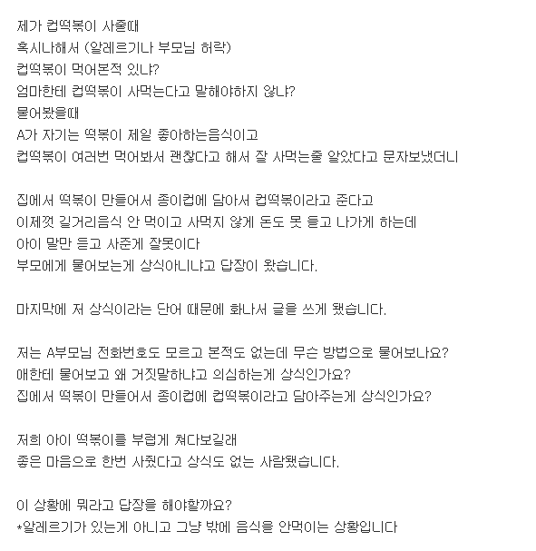 글쓴이는 “저는 A부모님 전화번호도 모르고 본적도 없는데 무슨 방법으로 물어보나요? 애한테 물어보고 왜 거짓말하냐고 의심하는게 상식인가요? 집에서 떡볶이 만들어서 종이컵에 컵떡볶이라고 담아주는게 상식인가요?” 라며 글을 마무리 했다.