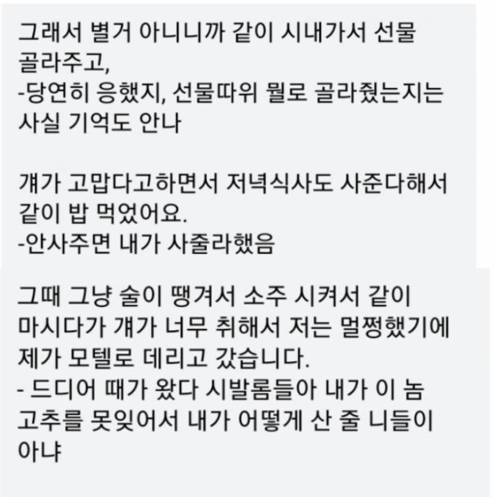 A씨는 “걔가 고맙다고 하면서 저녁식사도 대접한다기에 같이 밥먹었어요. 그때 그냥 술이 땡겨서 소주 시켜서 같이 마시다가 걔가 너무 취했어요. 저는 멀쩡했기에 제가 모텔로 데리고 갔습니다. 혼자 두기 그래서 같이 모텔에 있었어요”라고 전했다.