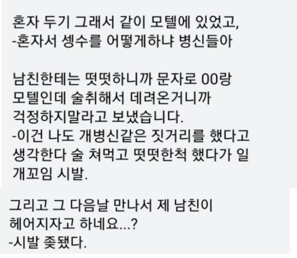 “OO(전남친)이랑 모텔인데 술취해서 데려온거니까 걱정하지마!”