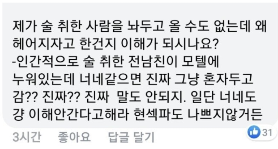 A씨는 “그 다음날 만나서 제 남친이 헤어지자고 하네요? 제가 술 취한 사람을 놔두고 올 수도 없는데 왜 헤어지자고 한건지 이해가 되시나요?”라며 글을 마쳤다.