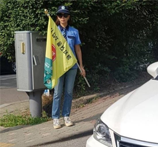 공개된 사진에서 고소영은 녹색 어머니 단복을 입고 깃발을 든 채로 횡단 보도 앞에 서 있다.