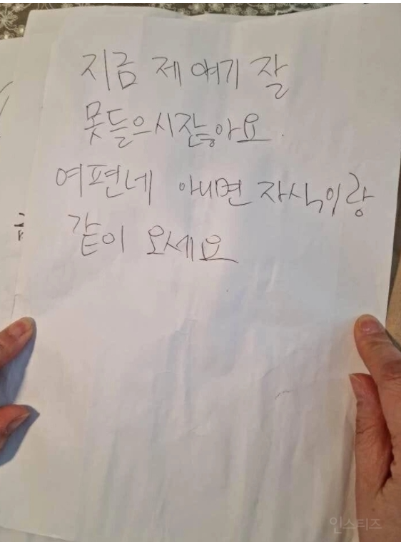 이러한 쪽지를 쥐어주고 집으로 오셔서 이걸 주셨다며 보여주는데 정말 화가 나서 미치겠습니다.