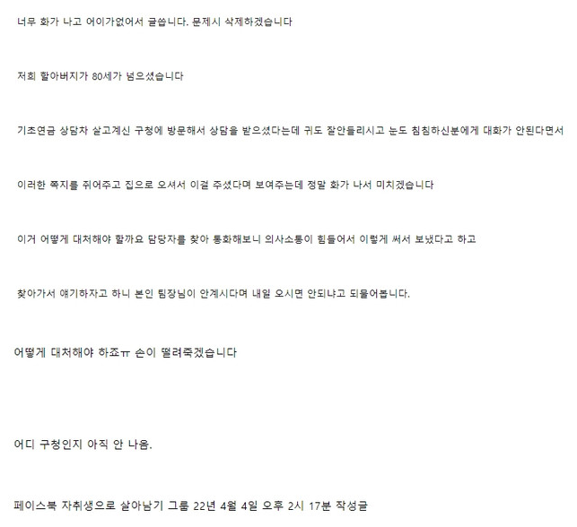 지금 sns에서 논란된 80살 할아버지가 구청에서 받은 쪽지