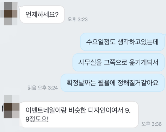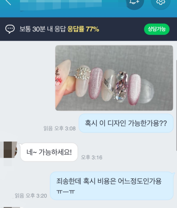 이번에도 팔로워 수 1만인 샵에, 자신이 원하는 디자인의 사진을 보내줘서 디자인 가격이 얼마인지 물어봤다.