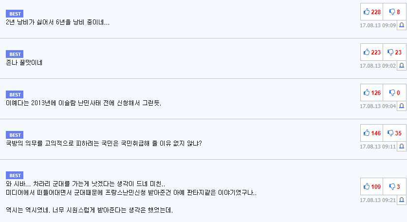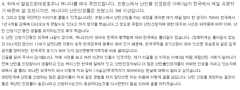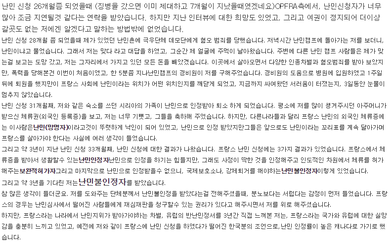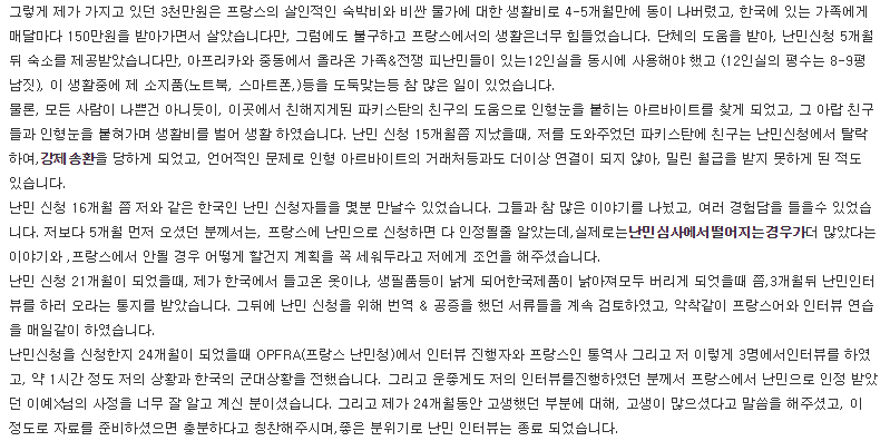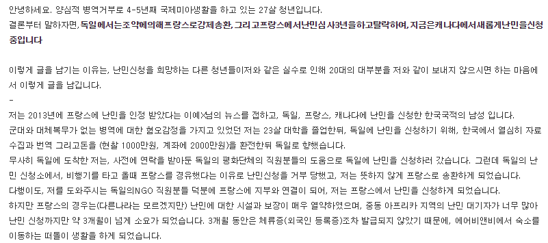 한 한국 남성이 한국에서의 군 입대를 원치 않아 프랑스로 난민 신청을 했고 놀랍게도 프랑스에서 한국 군대의 상황을 인정해 난민으로 받아주었다.