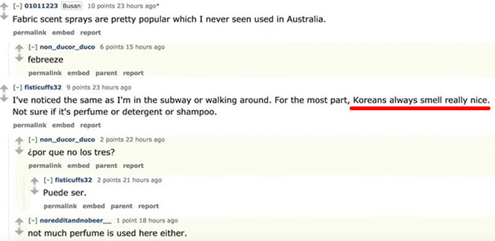 해당 게시물에는 많은 이용자들의 추측이 이어졌는데 “한국인은 수건을 깨끗하게 빨아 사용한다” “한국인은 믿을 수 없을 정도로 냄새가 좋다” “한국인들이 전반적으로 목욕과 세탁 등 위생관리가 철저한 편이고 좋은 목욕용품을 사용하는 것 같다” 등의 다양한 의견들이 나왔다.