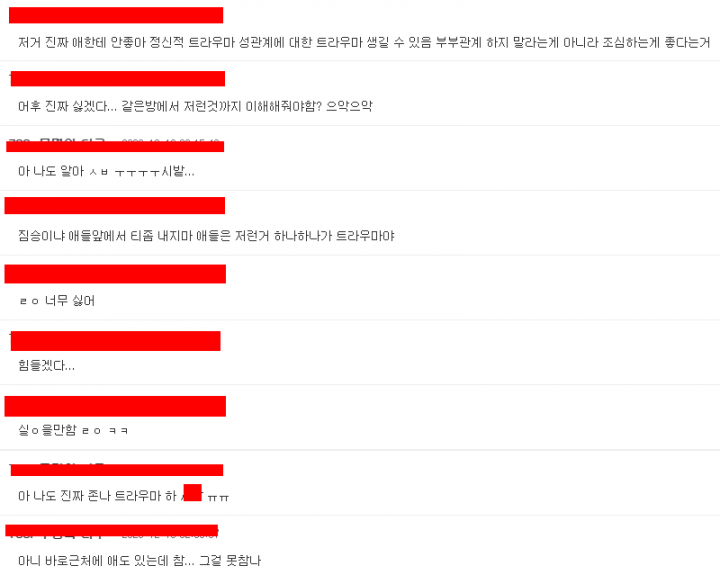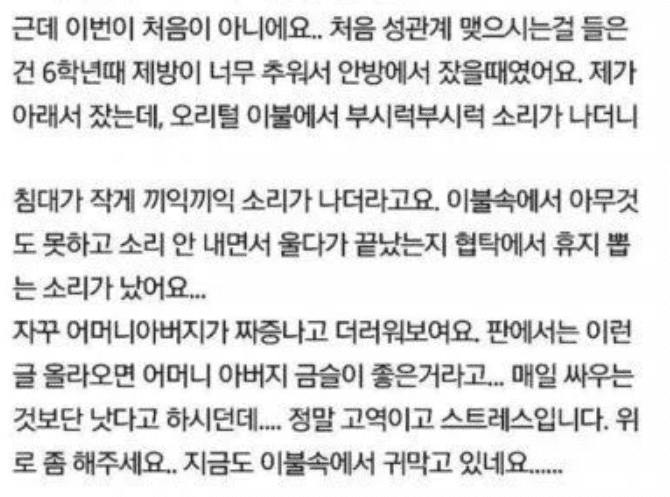 이같은 상황은 이번이 처음이 아니며, 처음 부모님의 성관계를 목격한 건 A가 초등학교 6학년 때 였는데 당시 A는 방이 너무 추워 안방에서 부모님과 함께 잠들었는데, 부모님이 같이 덮은 오리털 이불에서 소리가 나더니 침대가 흔들리는 소리까지 들렸다고 한다.