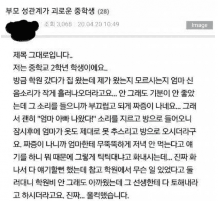 해당 게시글을 올린 작성자 A씨는 “부모 성관계가 괴로운 중학생”라는 제목의 글로 많은 이들의 관심을 끌었다.