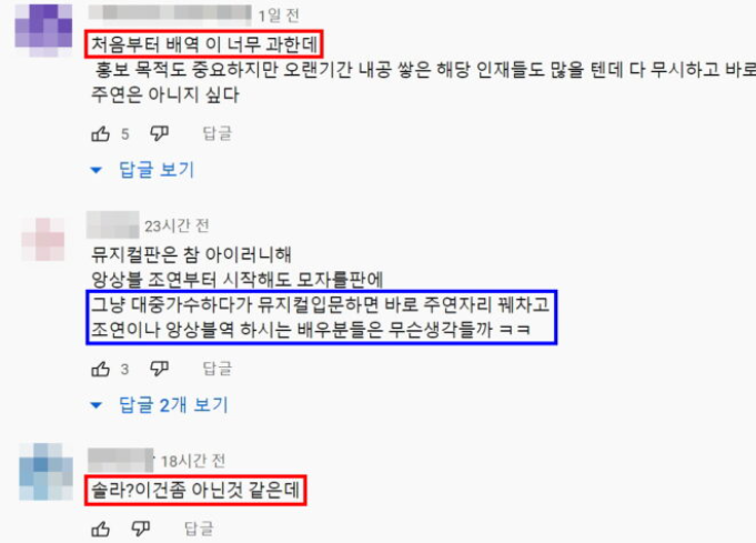 옥주현 이지혜 인맥 캐스팅에 이어, 옥주현 솔라 인맥 캐스팅을 의심하고 있는 상황이며, ”뮤지컬판”의 캐스팅에 대해 의문을 품고 있다.