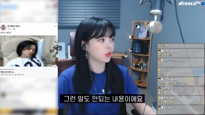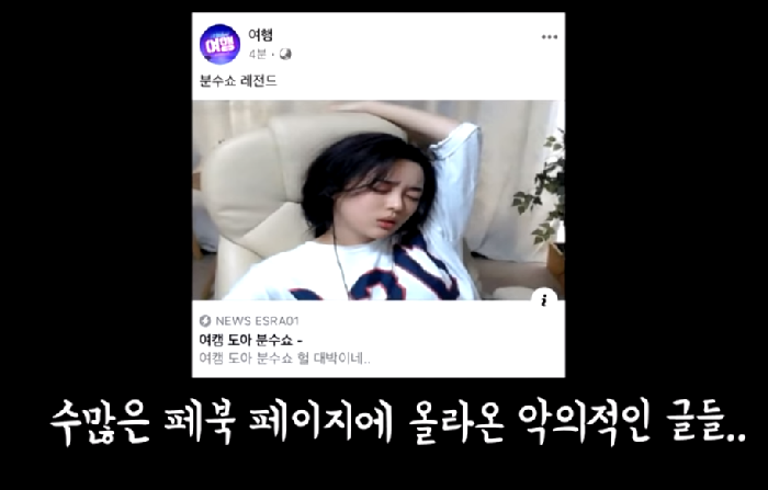 ‘여캠 도아 분수쇼 레전드’라는 게시글을 캡처한 화면을 띄우며 “제가 이때 되게 피곤하고 짜증 내고 있는 포즈로 어그로를 끌고 누르면 다른 내용이다”며 “사진 하나로 이렇게 만들 수도 있구나 생각했다. 이걸로 인해서 스트레스를 많이 받았다”고 토로했다.