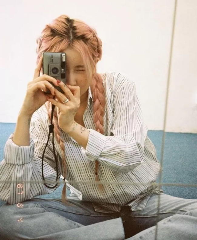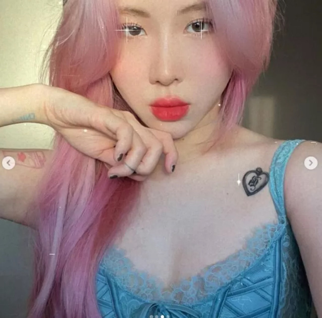 또한 “머리 안 감은 날엔 땋아요”라는 글과 함께 올린 사진에서는 나비 모양의 타투들과 오묘한 머리 빛깔이 절묘하게 어울려서 누리꾼들의 감탄을 자아냈다.
