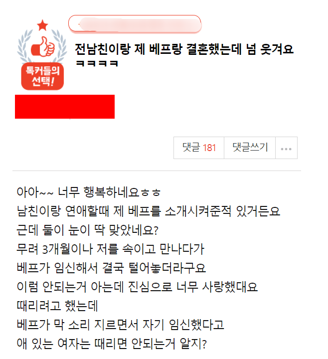 지난 온라인 커뮤니티에는 “전남친이랑 제 베프랑 결혼했는데 너무 웃겨요” 라는 제목의 글이 올라왔다.