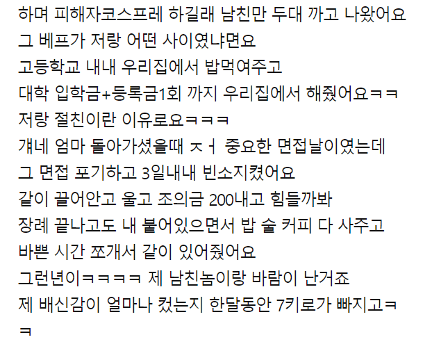 친구 B씨는 글쓴이 A씨가 고등학교 내내 집에서 밥을 먹여주고 대학 입학금, 등록금 1회까지 A씨의 집에서 내준 바 있다.