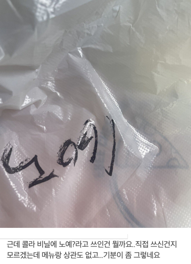 소비자는 “음식을 잘 받았는데 콜라를 담은 비닐에 노예라고 적혀있는데 이게 뭔가요?”라며 이야기를 시작했다.