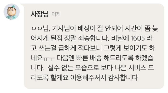이에 해당 음식점 주인은 “죄송합니다 고객님 그건 노예라고 적은 게 아니라 1605라고 쓰는 걸 급하게 적다 보니 그렇게 보이기도 하는 것 같네요 죄송합니다.”라고 답했다.