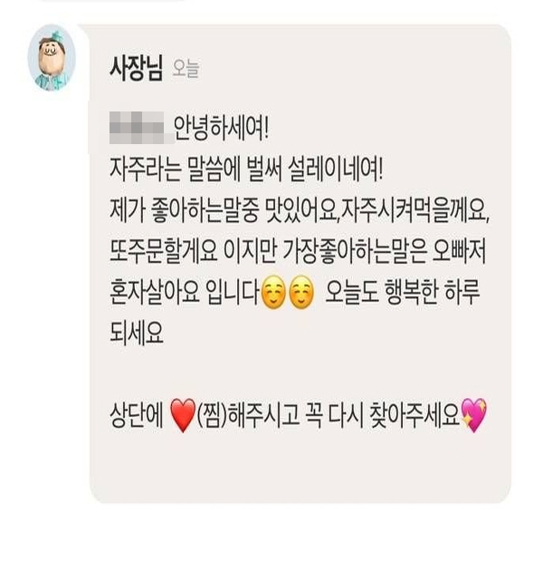 이어서 사장님은 “오빠 저 혼자 살아요. 라는 말을 가장 좋아합니다.”라고 말을 덧붙였다.