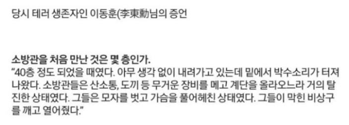 또 “앳돼 보이는 소방관이 올라오고 있었다. 사람들은 그에게 박수를 쳤고 나도 그에게 박수를 쳤다. 그 뒤 3개월 이상 꿈에서 그 소방관의 눈빛을 보곤 했다. 그때마다 잠에서 깼다. 죽으러 올라가는 사람을 향해 박수를 쳤다는 죄책감에 괴로웠다”고 심경을 토로했다.