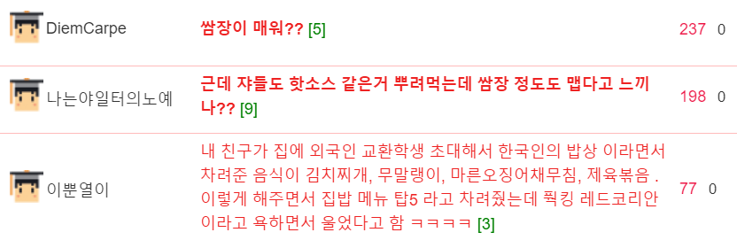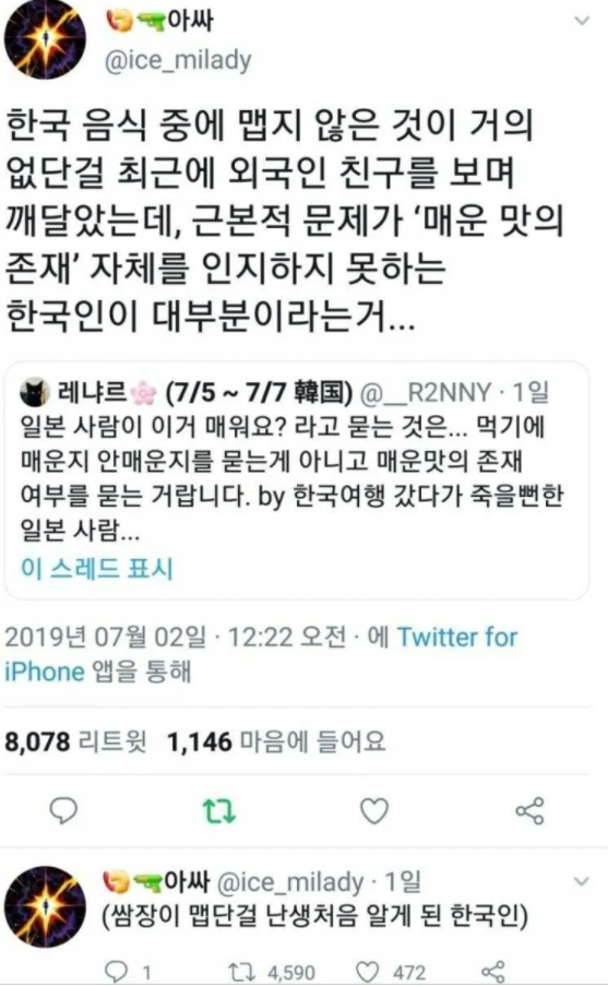 또한 일본의 어느 커뮤니티 네티즌은 “일본 사람이 매운 음식인가를 물어본다면 매운맛의 존재 여부를 묻는 겁니다.”, “쌈장을 처음 먹고 매워서 혼났습니다.”라며 당시 상황을 전했다.