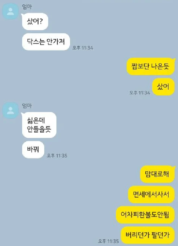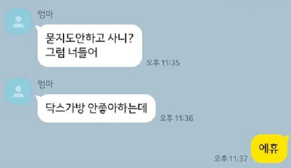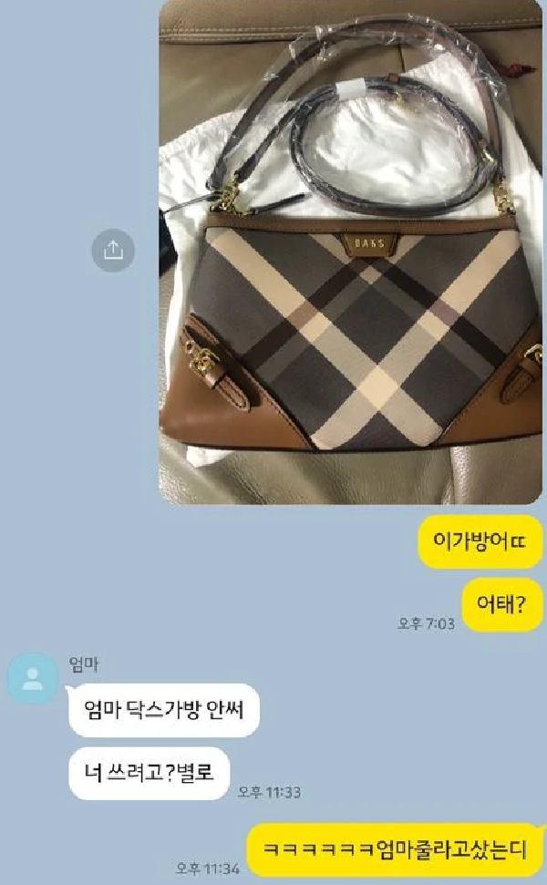 그러나 엄마의 반응은 예상과 달랐다. “엄마 주려고 샀다”는 A씨의 말에 “엄마 가방 안써. 너 쓰려고? 별로, 안 가져”라고 답했다.