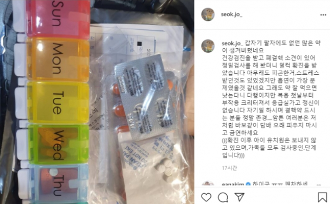 조 작가는 7일 자신의 인스타그램에 “갑자기 팔자에도 없던 많은 약이 생겨버렸다”며 “건강검진을 받고 폐결핵 소견이 있어 정밀검사를 해 봤더니 덕컥 확진 받았다”고 밝혔다.