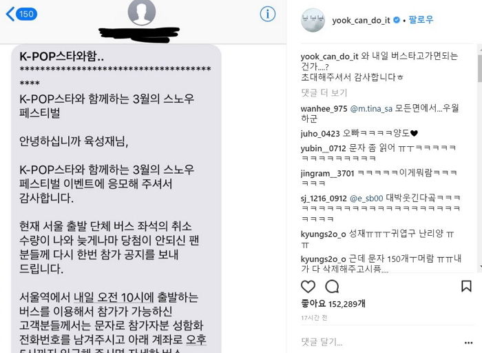 관계자는 “단체 버스 좌석의 취소 수량이 나와 늦게나마 당첨이 안되신 팬분들께 다시 한번 참가 공지를 보낸다”며 출발시간과 장소를 알리는 문자를 보냈다.