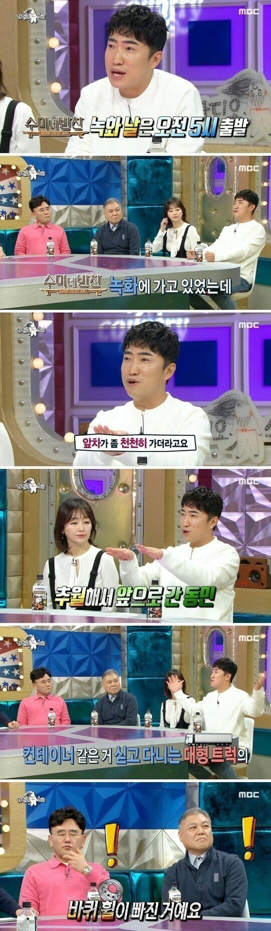 개그맨 장동민은 “녹화를 위해서 운전을 하고 가던 중 대형 트럭의 바퀴 휠이 빠진 것을 발견했습니다.”라며 이야기를 시작했다.