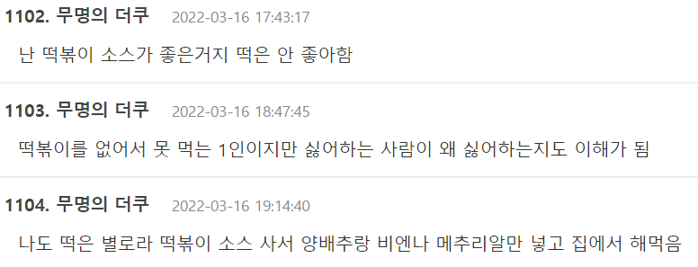 이를 본 온라인 커뮤니티 네티즌들은 “저도 떡볶이를 별로 좋아하지 않아요.”, “떡볶이는 없어서 못 먹는데요.”라는 반응을 보였다.
