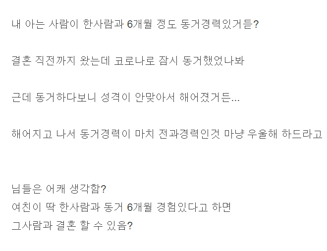 과거 온라인 커뮤니티에는 “여친의 동거 경력 어떻게 생각함?”이라는 제목의 글이 올라왔는데 글에 따르면 글쓴이의 지인 A씨는 남자친구와 6개월 정도 동거를 한 경험이 있다고 한다.