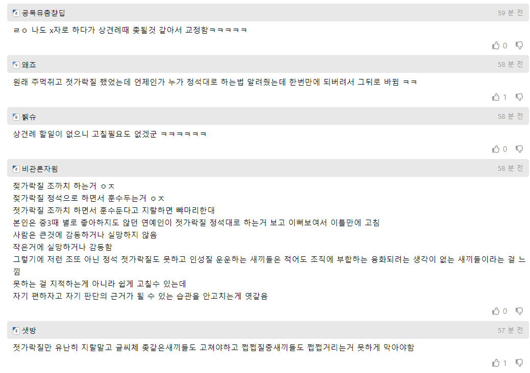 이를 본 온라인 커뮤니티 네티즌들은 “도대체 젓가락질을 어떻게 하든 무슨 상관이죠. 이런 거로 뭐라 하면 꼰대 소리 듣는 겁니다.”라는 반응을 보였다.