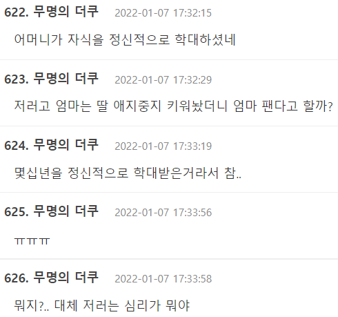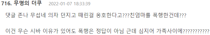 그러나 일부 네티즌들은 “부모 자식 둘다 망가졌네” ,”댓글 존나 무섭네 의자 던지고 때린걸 옹호한다고???친엄마를 폭행한건데???”, “결국은 자기 선택이지 요즘 뭐든 다 부모 탓 하는 거 유행인 듯”등의 반응을 보였다.