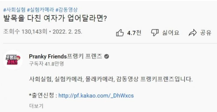 지난달 25일 유튜브 채널 ‘프랭키 프렌즈’는 “발목을 다친 여자가 업어달라면?”라 제목의 영상을 게시했다.