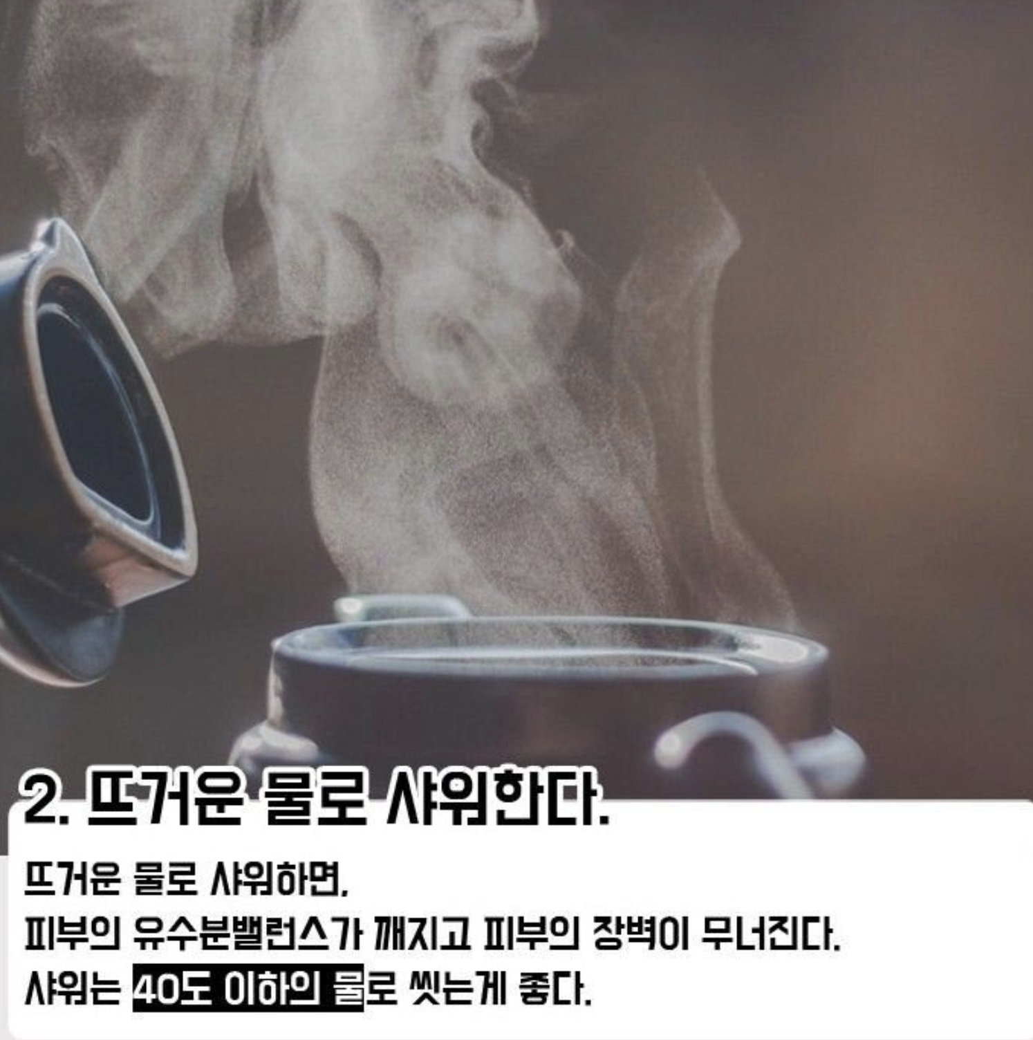 뜨거운 물(40도 이하)로 샤워하면 피부의 유수분밸런스가 깨지고 피부의 장벽이 무너진다.