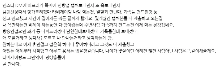 하지만 그럼에도 불구하고 악플러 들은 계속해서 그녀에게 악플을 보냈고 최근 타 BJ와 생긴 일로 더 많은 악플과 DM을 보냈다.