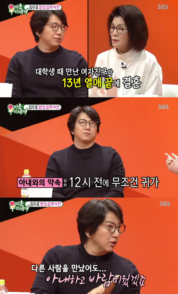 이에 “결혼한 지 11년 정도 됬는데, 12시 넘어 들어오는걸 이해해주지 않느냐?”는 질문에 김수로는 “내가 한 약속이니 내가 지키는 것이다. 아내에게 이해를 바라지 않는다.”라고 말했고, 김수로의 아내 사랑에 다들 입을 벌려 칭찬을 했다고 한다.