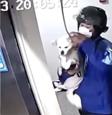 엘리베이터 문에 목줄이 끼어 죽을 뻔한 강아지가 배달 기사 덕분에 구출되었다.